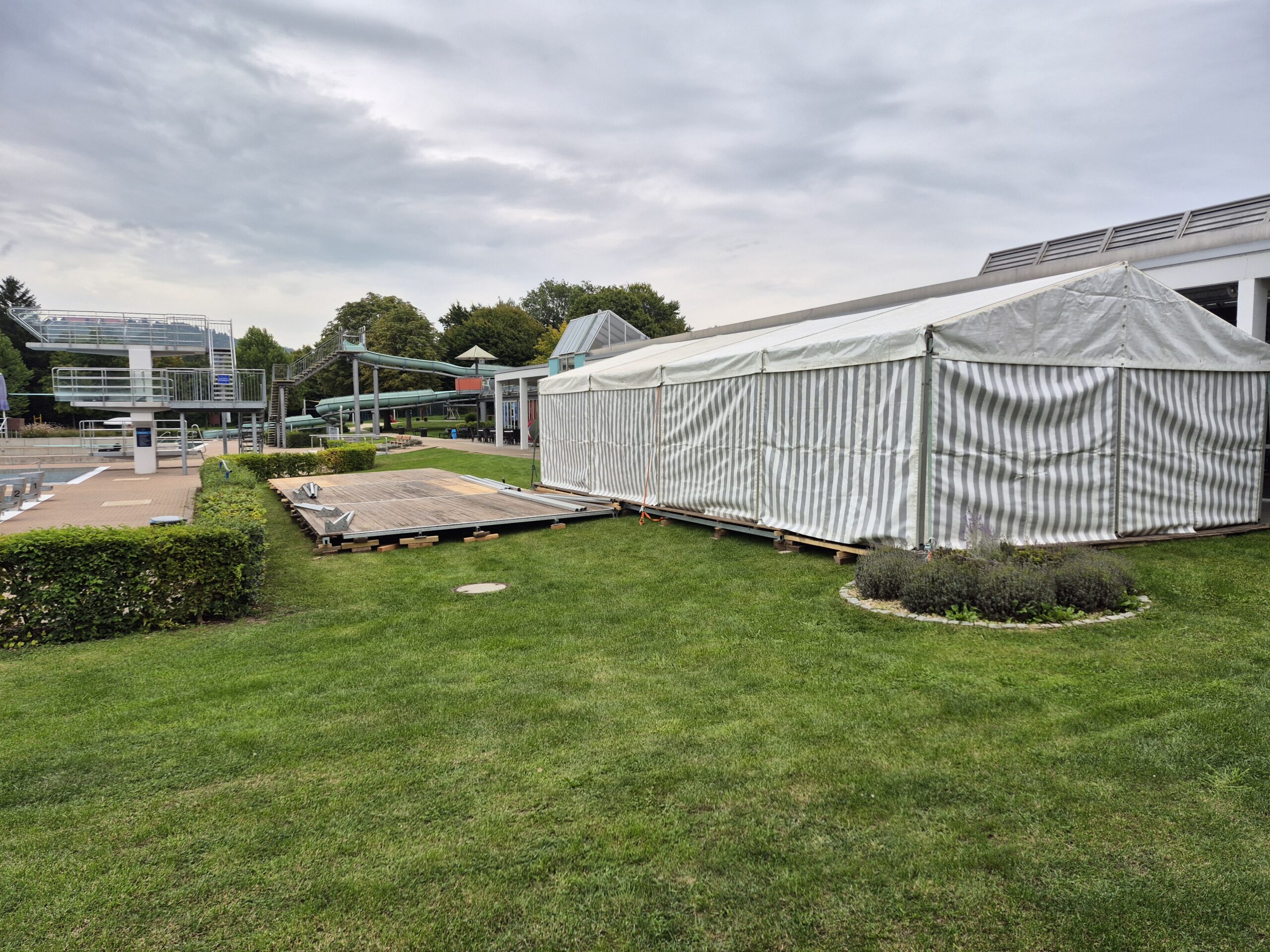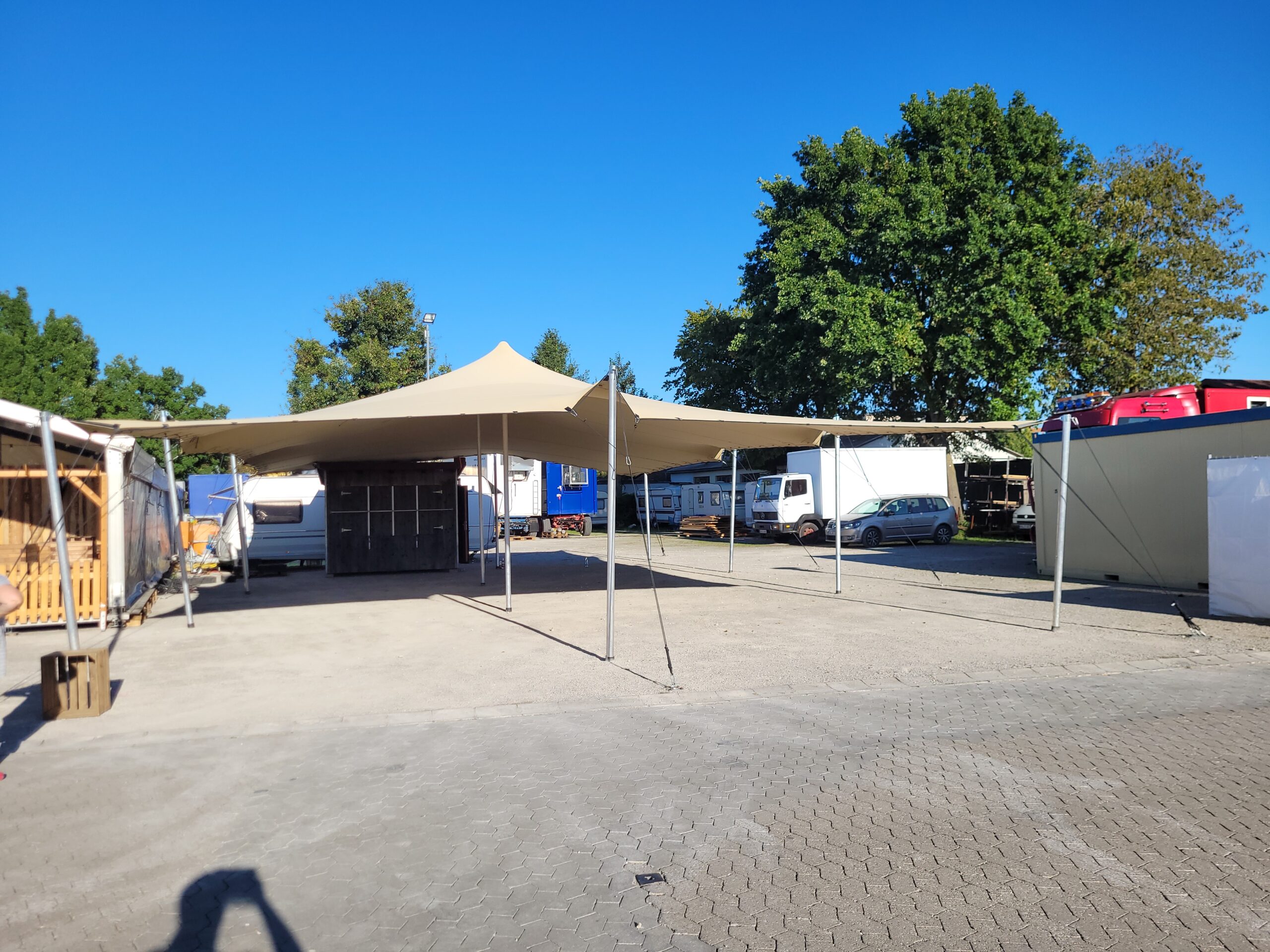 Durch seine flexible Bauweise kann das Stretchzelt offen gestaltet oder seitlich etwas nach unten gezogen werden. Dadurch entsteht bei Bedarf ein zusätzlicher Schutz vor Wind und Regen, ohne den offenen Charakter zu verlieren. Für den fachgerechten Aufbau inklusive der notwendigen Verspannungen wird eine Gesamtfläche von ca. 16 x 20 Metern benötigt.