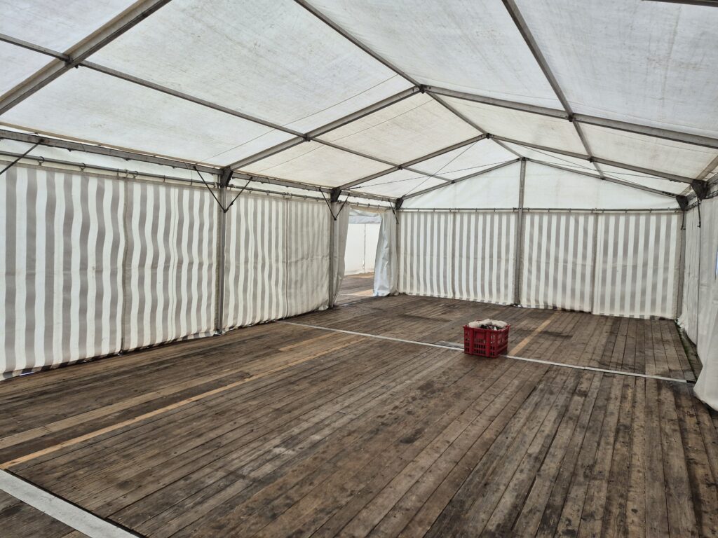 Zulassung: Das Zelt verfügt über ein gültiges Prüfbuch für „fliegende Bauten“ gemäß den aktuellen Sicherheitsnormen.