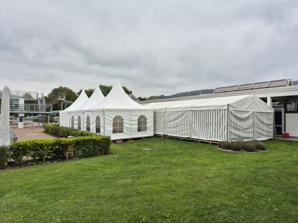 Die stabile und wetterfeste Konstruktion gewährleistet hohe Sicherheit und Zuverlässigkeit auch bei anspruchsvollen Witterungsbedingungen. Hochwertige Planen sorgen für Schutz vor Regen, Wind und Sonneneinstrahlung und schaffen gleichzeitig eine helle, freundliche Atmosphäre im Innenraum. Ergänzend kann das Zelt individuell mit Boden, Seitenwänden, Beleuchtung sowie dekorativen Elementen ausgestattet werden, um sowohl Funktionalität als auch Ambiente optimal anzupassen.