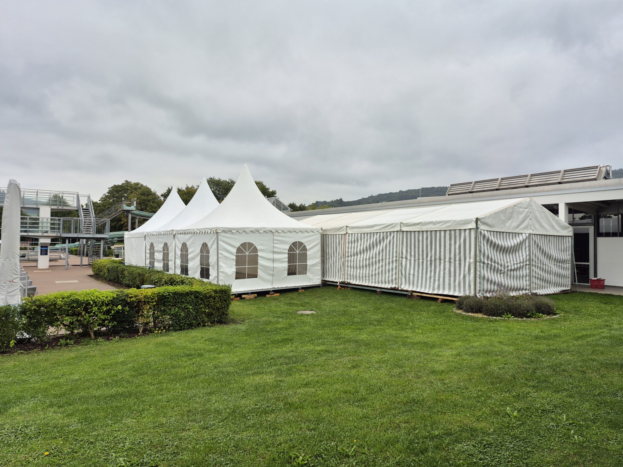 Optional kann das Zelt mit Seitenwänden, Fensterelementen, Boden, Beleuchtung oder Dekoration ausgestattet werden, um Komfort und Ambiente gezielt zu erhöhen.