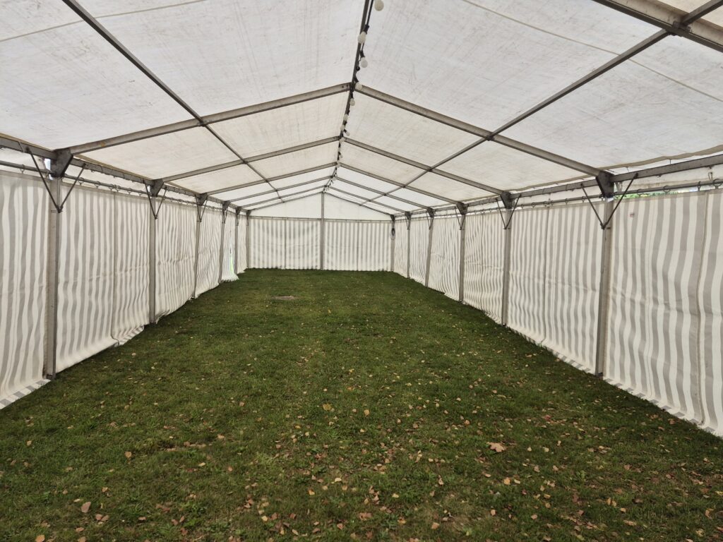 Durch die längliche Bauform lässt sich der Innenraum flexibel gestalten. Je nach Bedarf können Festzeltgarnituren, Stehtische, ein Buffetbereich oder eine kleine Tanzfläche integriert werden. Auch als wettergeschützter Sitzbereich oder Bewirtungszelt bietet diese Größe ausreichend Platz für eine angenehme und funktionale Nutzung.