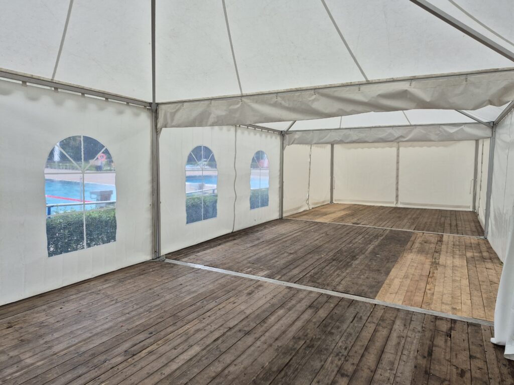 Optional kann das Zelt mit Seitenwänden, Boden, Beleuchtung oder Dekoration ausgestattet werden, um Komfort und Ambiente gezielt zu erhöhen.