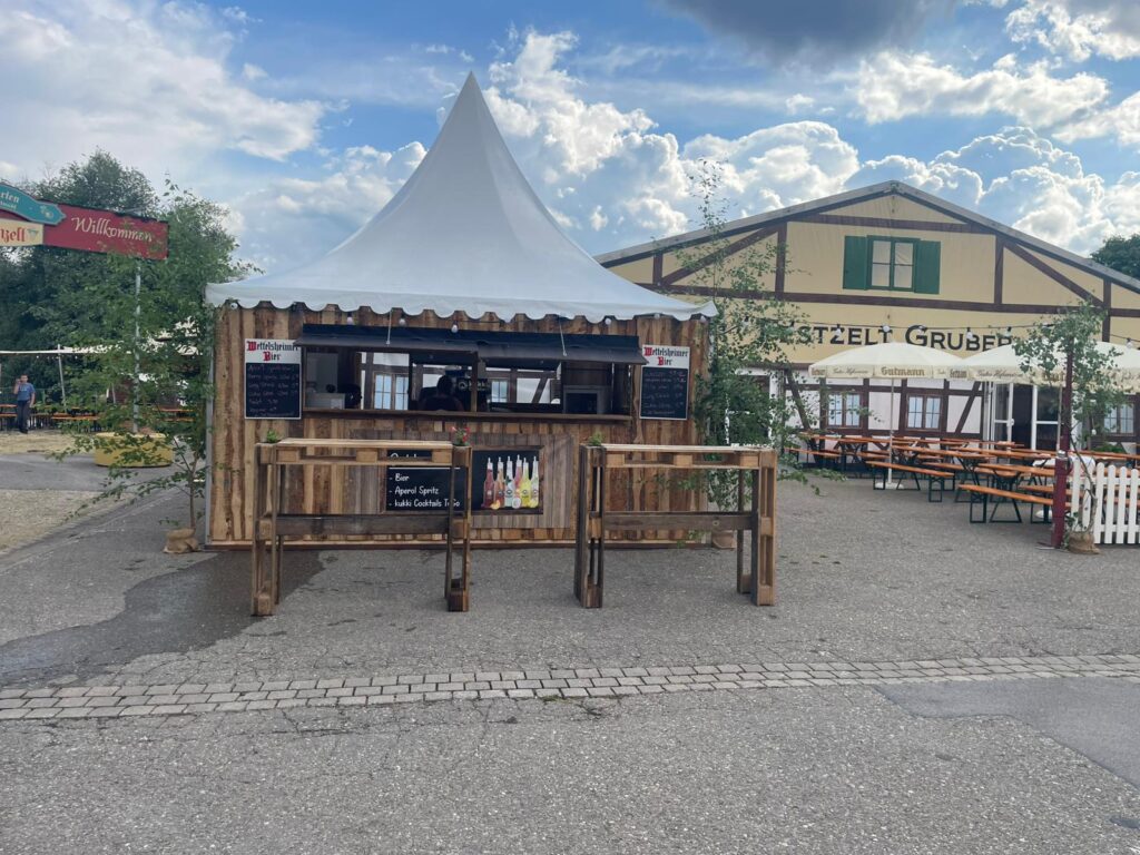 Die Pagoden können zudem mit vorhandenen Holzelementen als Verkaufsstand genutzt werden. Dank des Zugangs von allen vier Seiten eignet sich diese Variante besonders für Märkte, Vereinsfeste oder Ausschankbereiche. Der Verkaufsstand ist abschließbar und bietet somit zusätzliche Sicherheit bei mehrtägigen Veranstaltungen oder Lagerung von Waren und Equipment.